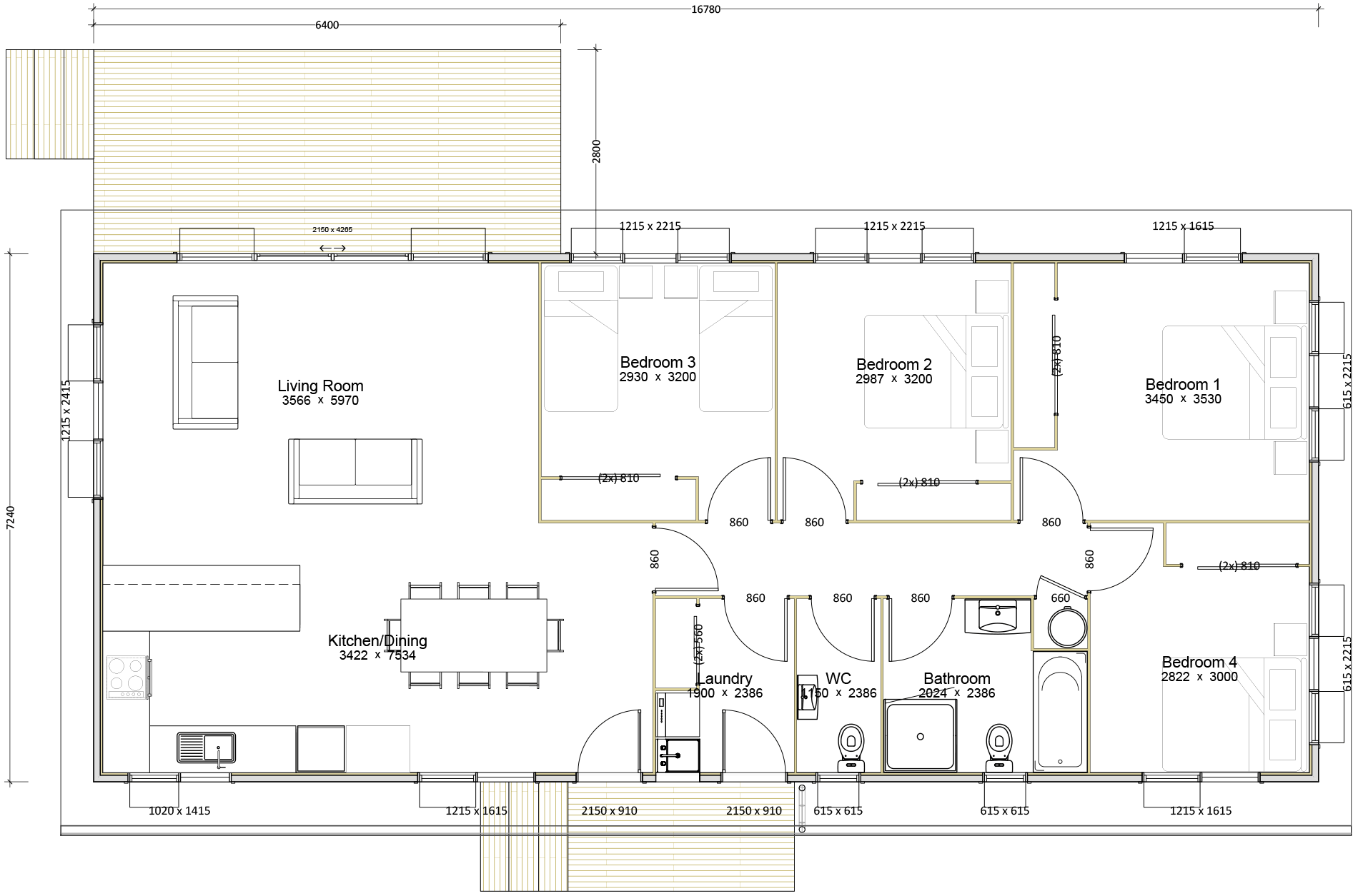 A central hallway connects four well-proportioned bedrooms, while a family bathroom, separate toilet, and a full laundry with external access keep the morning rush flowing smoothly. The straightforward 16.78 m x 6.40 m layout suits a wide range of sites and simplifies transport and installation.